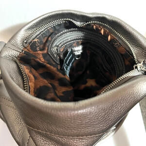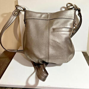 Medium sized Crossbody in a silver/pewter leather with a pebble texture.