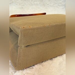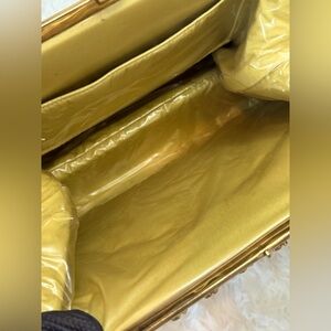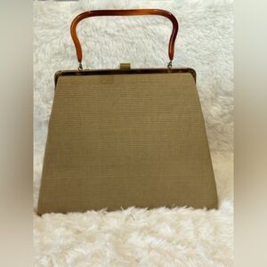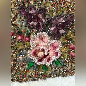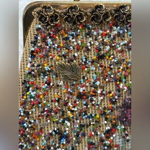 Step back in time with this stunning and highly collectible Vintage Soure of New York handbag. Circa 1950's, This exquisite piece features a heavily embellished tapestry design with a vibrant mix of sparkling glass seed beads and jeweled accents, depicting an intricate floral motif. The bag is accented by a beautiful, amber-colored Lucite top handle and a secure metal clasp closure. Topped is lined in beautiful gold bouquets and each corner is adorned with gold leaf emblems. Interior is clean with no rips or stains. It is lined in vinyl, as is a characteristic of these mid-century designs. The back exterior has a few small spots along the bottom (see pic) with very minor rubbing on one corner. Overall, this bag is in excellent vintage condition and is a beautiful statement piece for any vintage lover or collector.!