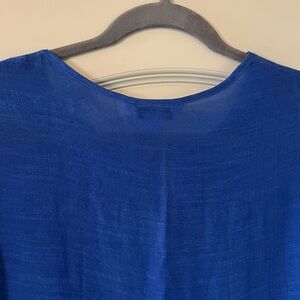 EUC excellent condition! Beautiful rich blue polyester & rayon blend by Counterparts. Ruffle open split sleeve. Tie front with keyhole. Fit & flare with pleating detail. Lightweight. Women’s size XL. Smoke free home