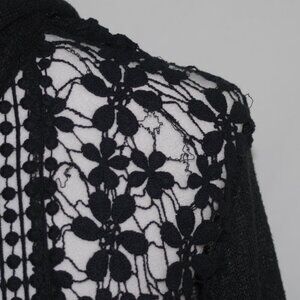 haute monie Womens Large Cardigan Sheer Open Front Black Sweater Hoodie Duster Floral AUC This women's duster cardigan sweater is in acceptable condition; it has some piling and some of the connections are frayed, but it is mostly good and the frays in my opinion are not a big problem. The approximate measurements are: 44” shoulder to bottom and 22” pit to pit.