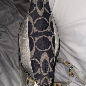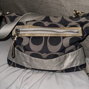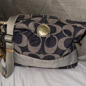 Coach vintage distressed canvas monogrammed navy and silver crossbody with tan leather strap accents and zipper pull the strap is adjustable and one side comes off you can add another one too inside is perfect no call outs just is vintage distressed look bay bought- off Poshmark in zaddys show love this bag guys has zipper pocket on back and one inside and two pockets on other side medium size smoke free home