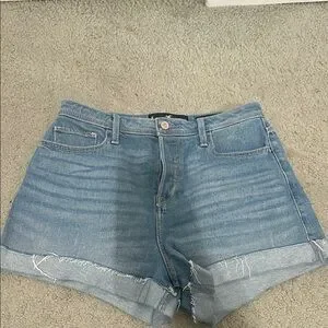 These Hollister jean shorts feature a light blue wash with a high-waisted design and stylish cuffed hems. The medium-weight denim offers a comfortable fit, making them perfect for casual outings.