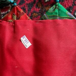 This spectacular wall hanging measures 7 feet long by 17" inches high. It has fabric tabs for hanging, and the back is lined in red cotton. It features multi colored pieces of satin brocade fabric, and is embellished with gold thread, fringe and beads. it was purchased at the Tibetan Buddhist Naropa University in Boulder Colorado in 1994, and has been carefully wrapped and placed in a closet since then. It would be perfect in a meditation space, or as a dramatic wall decor item.
