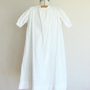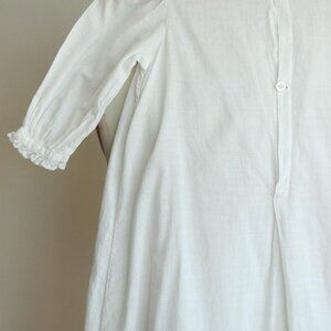 Beautiful vintage baby dress in white cotton from the 1900s. French seams, lace trim at collar and cuffs, lightly pigeon bust shape. High neckline, and two sweet little buttons in back. Possibly meant for a Christening or Baptism originally but cute for any purpose.