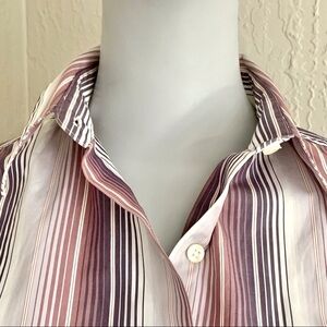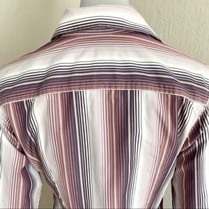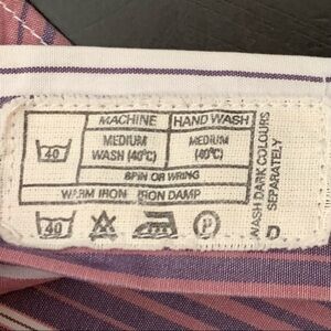 Size 4. Very good condition. No fading/staining etc One small mended area on back hem. No other signs of wear. See last 3 photos. Washed, ironed and ready to wear! 100% Cotton poplin. Shades of plum, lavender, light pink and white. Button front and 2 buttons on cuffs. Approximate measurements (taken when laying flat - cannot guarantee fit)
