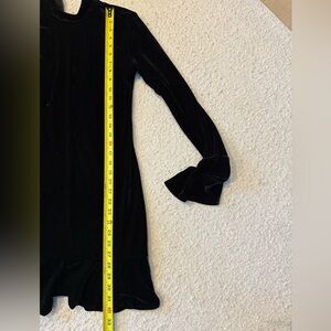 Step out in style with this elegant black velvet dress. Perfect for any occasion, this dress features a chic ruffled hem and long sleeves. A must-have addition to your wardrobe.