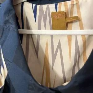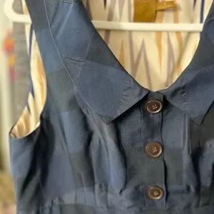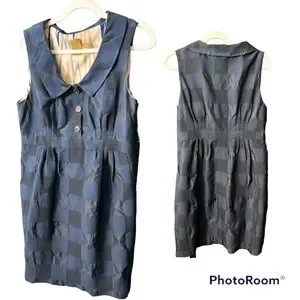 This unique Ali Ro - Anthropologie checkered pattern Navy Blue mini sheath dress offers an interesting open V-neck scoop neck collar, 2 pockets in the skirt (also fully lined), 3 large navy buttons down the bust, accent pocket left bust, and invisible side zipper closure. Fully lined beautiful geometric print with complementary colors. This dress is a classic cut and great staple for your closet rotation! The collar and cut give it a slightly retro vibe. Can be worn to the office or semi formal events.