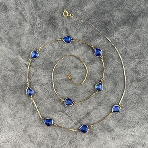 Blue Bezel Set Faceted Crystal Glass Hearts Gold-tone Chain Vintage Necklace 23"