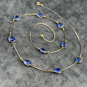 Vintage Necklace Gold-tone Chain with series of Blue Bezel Set Faceted Crystal Glass Hearts.