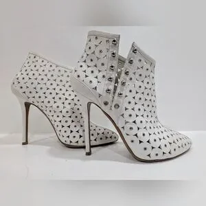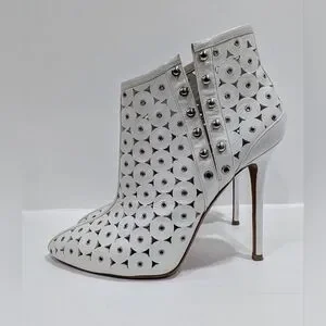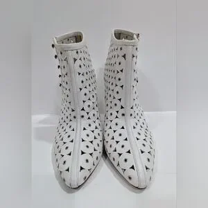 Alaia White Leather Laser Cut Heeled Boots with Grommets