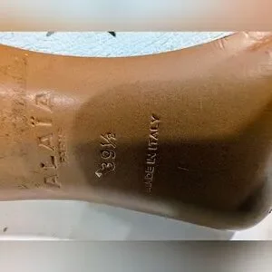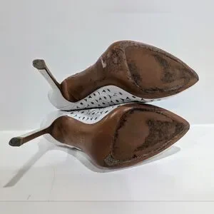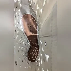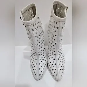 Step into elegance with Alaia's white heeled boots, featuring a sleek stiletto heel and intricate laser cut detailing. The pointed toe and open side add a modern touch to these stylish boots, perfect for making a statement. EUC