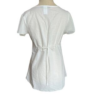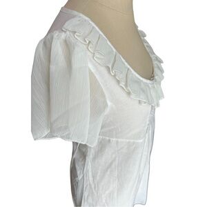 Girl Talk Ivory Sheer Ruffle Flutter Sleeve, Bridgerton Vibe, Tie in back, Babydoll Blouse in Size Medium, 3 buttons at center front, and scoop neck, Fabric: 100% cotton.