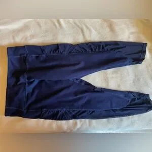 Two side pockets. Mesh inserts on outside of both legs down and around ankle. About mid thigh one stripe goes around to back of leg.