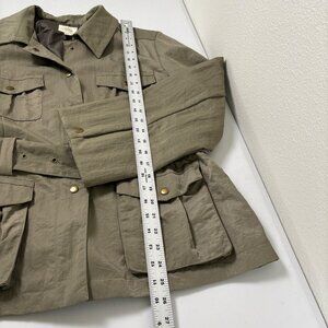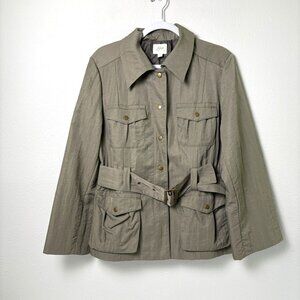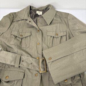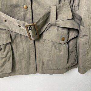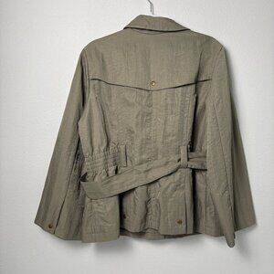 J Jill Cargo Utility Jacket Petite L LP Green Nylon Snap Safari Trench Belt Coat