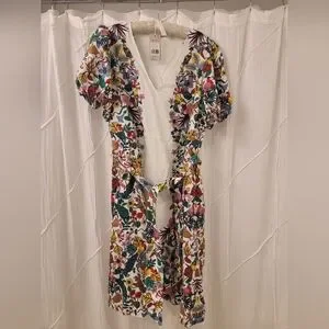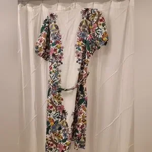 You'll love this linen midi dress. An intricate floral print climbs up each side and over the shoulders for top-to-toe wow factor. The middle is cinched by a coordinating self-tie belt, and for a showstopping finish and heaps of volume, the elbow-length sleeves are puffed at the shoulders and nipped in by stretchy cuffs.