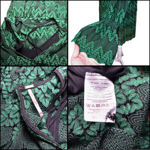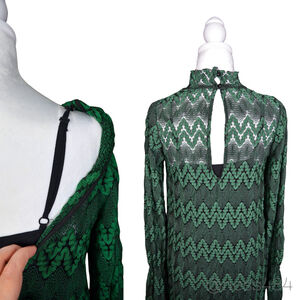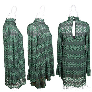 This Free People green lace dress features a mock neck, long sleeves, and a chevron pattern. The dress is mini-length with a flared hemline. It's made from a delicate lace fabric with a dark green and black pattern. The back has a keyhole opening. The dress includes a built-in slip. The left adjustable strap with the lining has come undone (see picture). The material composition is listed as Lace, lining: Viscose.