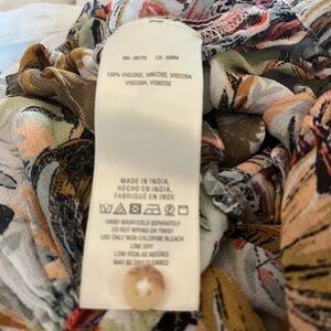 This white sheer button up(extra button attached to the inside tag) front blouse has a multi colored pattern throughout with flowers/butterflies, & birds. It has a front bottom middle tie bow & is 100% Viscose. It measures 22 inches long. Like new. . Never worn!!!