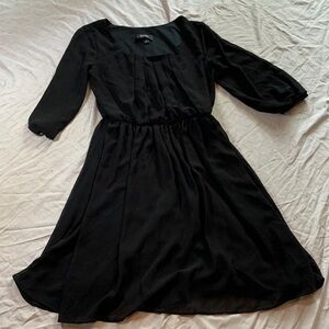 Lightweight, flowy, black dress with sheer three quarter sleeves from by & by, empire style waist, would be good for a base for a costume for cosplay or halloween. Super cute, would be good for the office or a night out