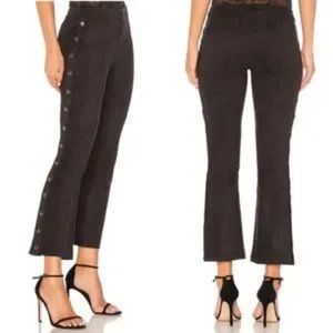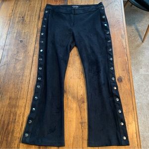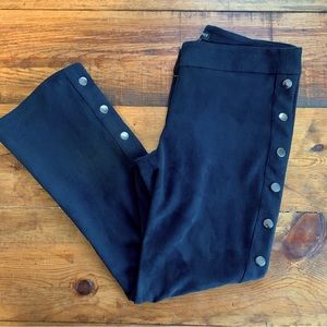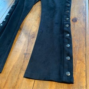 Micro suede black pants with metal snaps along the sides. Front zipper. Flattering fit. Super soft fabric.