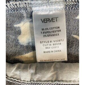 Vervet Flying Monkey Women's Denim Jean Jacket in medium, features a unique dyed bleach wash. Made from a blend of cotton, polyester, and spandex for comfort and flexibility.