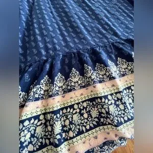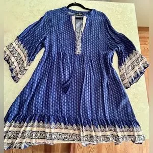 Stylish blue dress with intricate patterns in blush & cream. Features a tassel tie, floral accents, paisley print, & bell sleeves