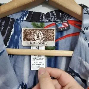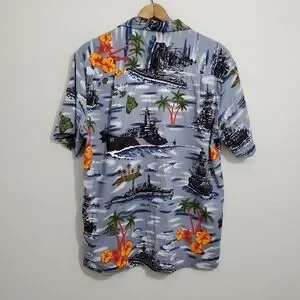 Pre-owned vintage Kalaheo made in Hawaii shirt, size medium. It's made of a cotton/rayon blend fabric that's lightweight with no stretch, has a single chest pocket, buttons down in the front, and it comes in a tropical print with US ships from the Pearl Harbor attack. It's in excellent condition, no stains, rips, etc.