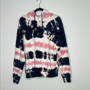 Stylish tie-dye hoodie featuring pink and navy patterns. Perfect for casual wear.