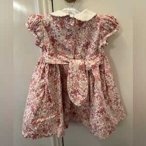 Adorable baby dress with a floral pattern. Features a white collar and short sleeves. Perfect for special occasions.