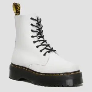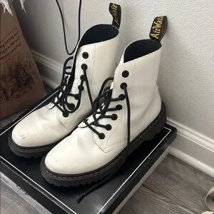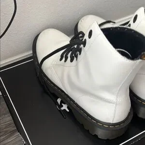 These Dr. Martens lace-up boots showcase a bold contrast of white leather and black detailing, including the laces and welt stitching. The 8-eye design and chunky black sole provide a classic yet modern combat boot look. With a high ankle design, these boots offer both style and support.