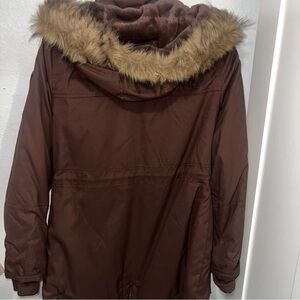 Stylish brown parka with faux fur lining. Features a hood with fur trim. Perfect for cold weather.