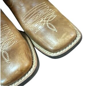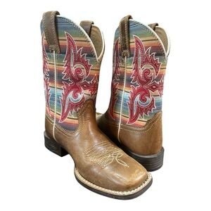 These Ariat kids' western boots feature a stylish brown leather design with vibrant multicolor accents. Perfect for little adventurers, these boots offer comfort and durability for all-day wear.