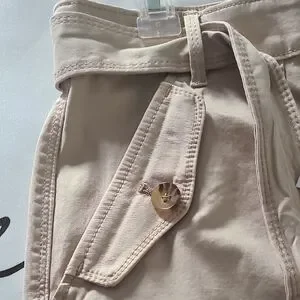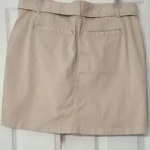 This tan utility mini skirt from White House Black Market features a chic pencil style with a tie front detail, perfect for casual or work settings. Its cargo-inspired design adds a touch of practicality while maintaining a sleek and modern look.