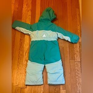 Cozy teal snowsuit with a hood. Perfect for winter adventures. In excellent condition. Worn a handful of times since it rarely snows here! The “grow cuffs” have NOT been cut, so this can be worn for 2-3 winters. It’s a cool feature!