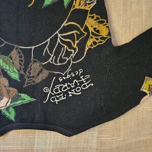 Adorable little y2k black sweater like babydoll style long sleeve with Ed Hardy design all over it.