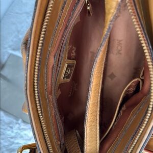 MCM Tan Leather Shoulder Bag with Monogram Print