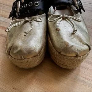 Step up your style with these chic gold platform espadrilles. Perfect for adding a touch of glamour to any outfit.