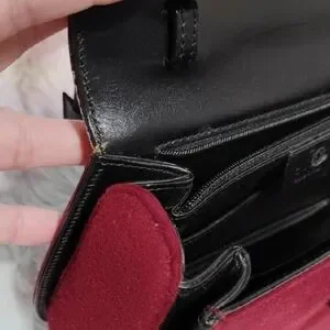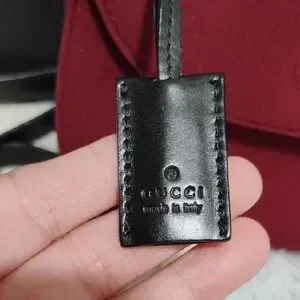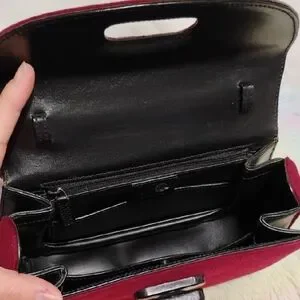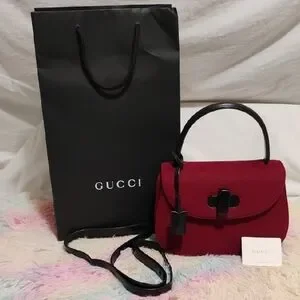 Authentic vintage Gucci shoulder bag in a deep red wool exudes sophistication with its structured design and elegant flap closure. The compact size and black detailing make it a versatile accessory for any occasion, while the crossbody strap offers added convenience. Has an original black leather strap that has some wear and cracks as shown but the handle is perfect! The strap can be replaced! Comes with the authentic removable strap, authentic Gucci bag, and Gucci booklet! Has a zipper pocket inside and open pockets inside!