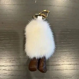 Adorable keychain featuring a yellow egg yolk with white fur. Includes brown legs and a gold clasp.