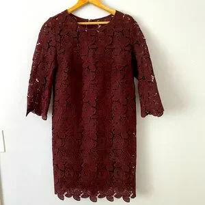 LOFT Women's Size 2 Wine Burgundy Lace Shift Dress Cocktail Party 3/4 Sleeve