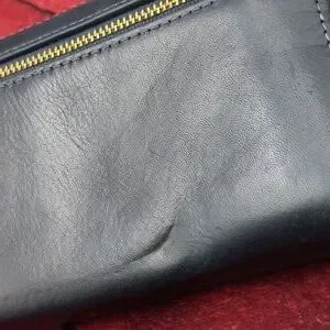 Large navy blue wallet with several pockets on the inside please note some flaking of the material at the top and on each side. There is also a dent on the back. approximate dimensions are 8 in across by 4 in in height diameter is 1 in please review pics and ask questions prior to purchase