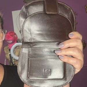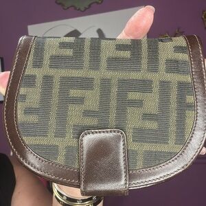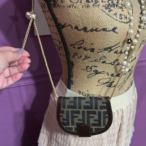 Stylish Fendi wallet bag in brown and tan. Features iconic logo pattern. I will add a gold tone and silver chain with it!
