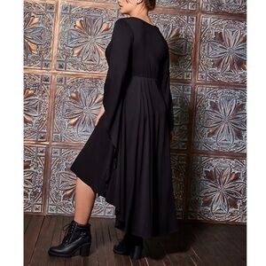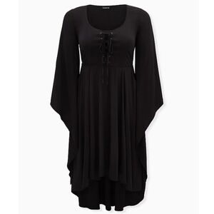 This costume-dress screams spooktacular with its exaggerated hi-lo hem, voluminous bell sleeves, and lace-up front. Make this All Hallows Eve one to remember, and one that will turn heads (maybe all the way around)!
