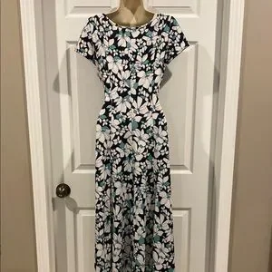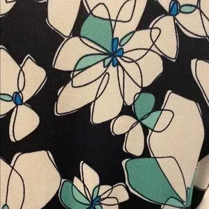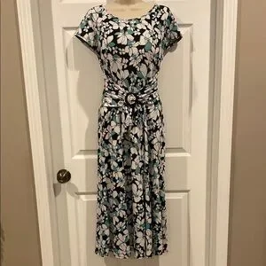 Elegant floral print dress has stretchy material and a stylish adjustable belted waist by perceptions. Perfect for any occasion. In like new condition. Black background with white, green and a touch of blue. Measurements: note taken from side seams bust 16 and waist 14 with the length of dress 45.