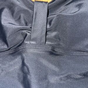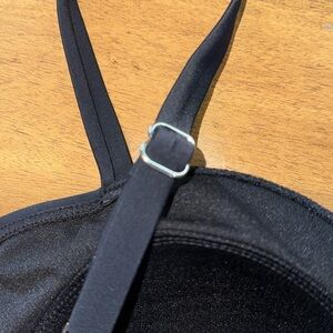 Stylish black ruched tankini top with adjustable straps and ruffle hem.
