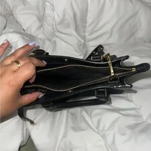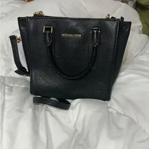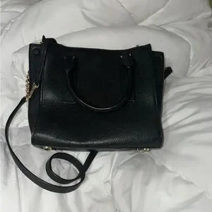 This sophisticated Michael Kors satchel in black features a structured design with winged sides and gold-tone hardware. Crafted from durable saffiano leather, it offers both style and practicality for everyday use.