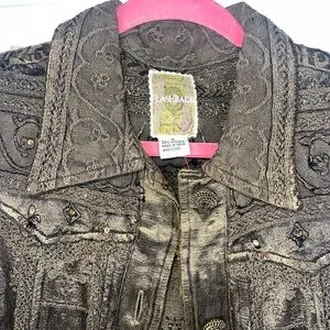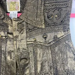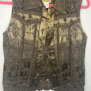 Elegant gold sleeveless vest with intricate lace details. Perfect for layering.