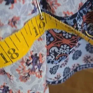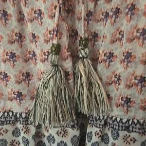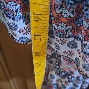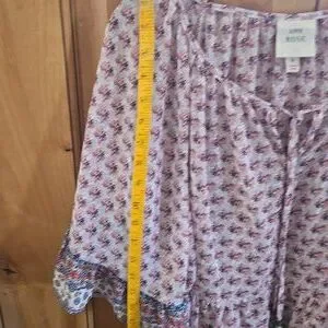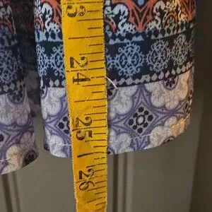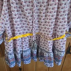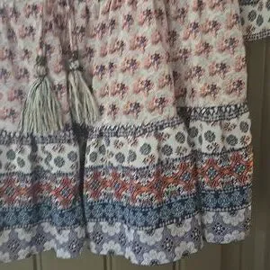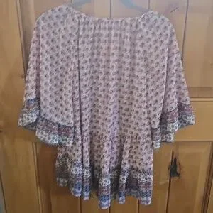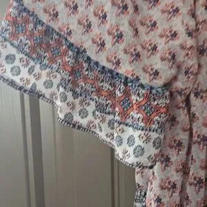 Light as air, shades of palest pink, dove grey, coral, light and dark blue. This boho floral print festival blouse features soft ruffles at the end of each airy angel sleeve and at the bottom hem. Perfect with jeans, shorts, skirts, over a slip dress, you name it. The graceful neckline is enhanced with a double tassel ended fabric string tie. Preowned in very good condition; looks rarely if ever worn. The length is @ 25 1/2", sleeve length @17". The airy angel sleeve openings are near the waistline which measures @19" across or @38" circumference. The 100% polyester easy care fabric has a chiffon look and is semi sheer.