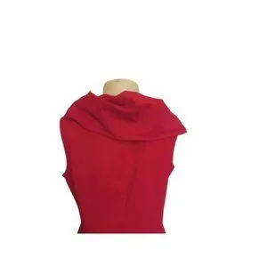 This dress showcases an elegant bubble hem design and a striking asymmetrical ruffle collar. Crafted for a flattering fit, it offers contemporary sophistication. 50 percent polyester, 43 percent nylon and 7 percent spandex. Nice red color in size medium. New with tags. Uneven hem that falls like a bubble.