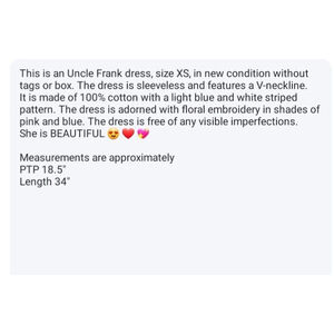 Add a touch of elegance and grace to your wardrobe with our 💕 Uncle Frank Dress in size XS. Featuring a beautiful blue and pink floral pattern that is delicately embroidered on a sleeveless design, this dress exudes femininity and charm. Made with high-quality materials, it provides both comfort and style for any occasion.