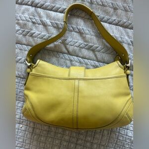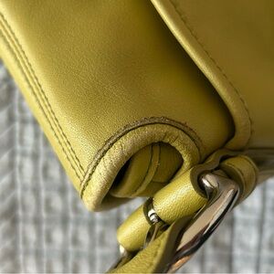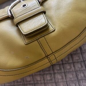 Lovely soft leather shoulder bag ready for summer adventures! There are small pen marks on the front of the bag and a small white spot as well. There is a pen marks and a white mark on the back as well. There is fading on the pipping as well. Interior has pink marks and some brown as well.
